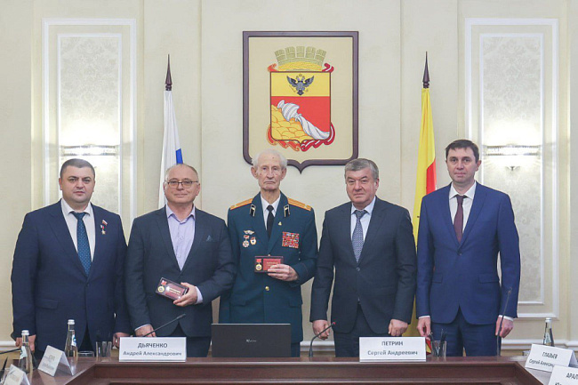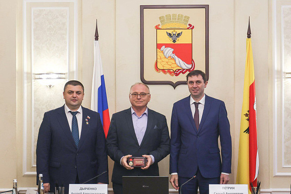 Председатель Воронежской городской Думы Андрей Дьяченко совместно с главой городского округа город Воронеж Сергеем Петриным вручили памятные знаки «Воронеж — город воинской славы».