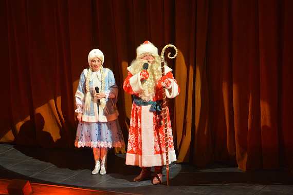 Приглашенных ждало на втором этаже театра возле ёлки сказочное театральное представление с участием Деда Мороза и Снегурочки. Актеры устроили для ребят веселые танцы и хороводы.