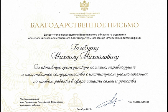 Неоценимый вклад в работу фонда вносит депутат городской думы Михаил Гамбург. Он активно участвует в реализации программ, направленных на защиту прав и интересов детей, поддержку многодетных семей, семей военнослужащих и заботу о детских домах.