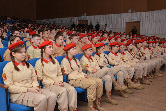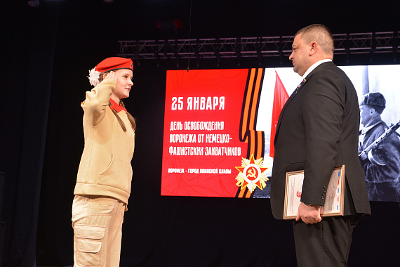 В Городском Дворце культуры накануне Дня освобождения Воронежа прошел общероссийский Урок Мужества. В зрительном зале - сотни юнармейцев со всего Воронежа и курсанты Военно-воздушной академии имени Н.Е. Жуковского и Ю.А. Гагарина, воспитанники военно-патриотических клубов.