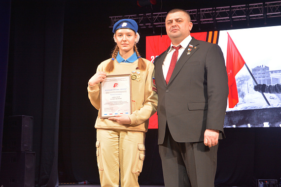 Председатель Воронежской городской Думы, Герой России Андрей Дьяченко наградил почетными грамотами особо отличившихся юнармейцев.